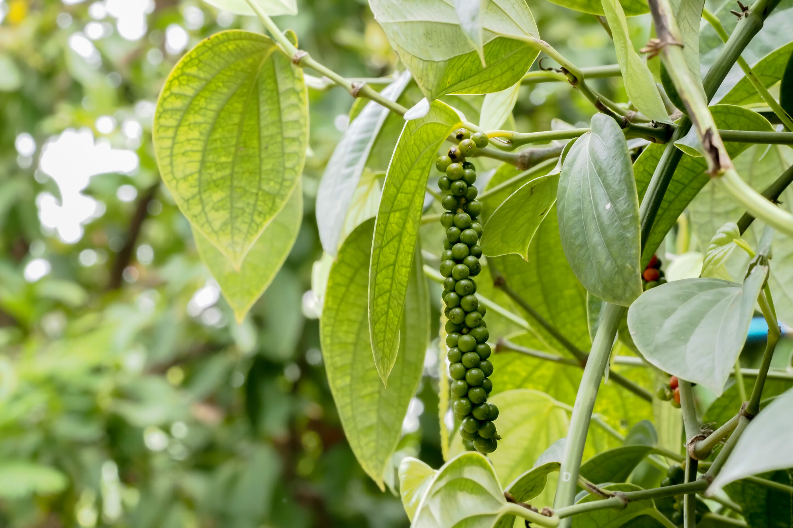 Black Pepper: Climbing crop providing annual yields alongside timber species